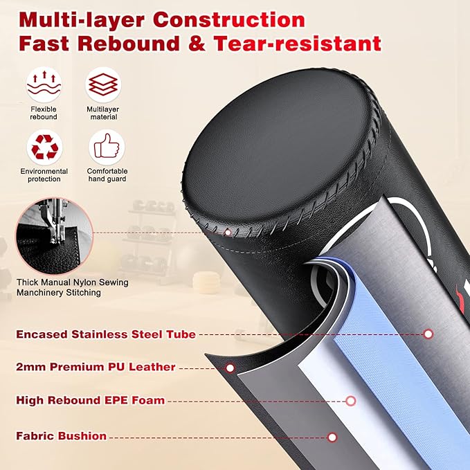 - Rebound Shock Absorption: Multi-layer construction with wrapped stainless steel tube, 2mm thick PU leather, high-density EPE foam, and eco-friendly fabric padding; 360° shock-absorbing rubber encased in foam (safer than springs for kicking) with quick-detach hook and loop fastener; Longlasting, quick rebound, and hand-protecting hardness balance