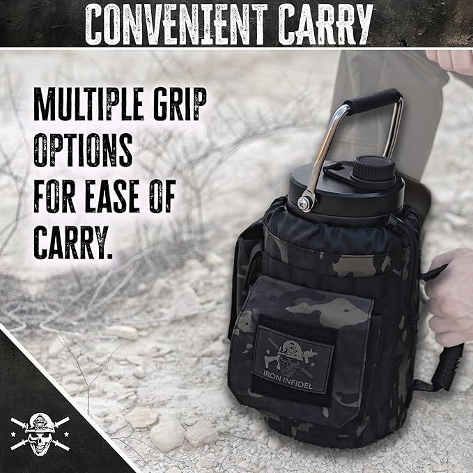 Iron Infidel Battle Bottle - One Gallon Insulated Water Bottle with Dual Carry Handles - 128 oz Tactical Stainless Steel Water Jug & Rugged Extra Large Sleeve With Storage (Black Camo 128 Ounces)