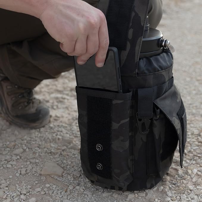 - REMOVABLE COVER - Made from military grade rip and tear resistant fabrics. The nylon cover is removable, washable, and has two extra large utility pouches for your cellphone, wallet, keys, and other EDC gear. Also includes a side grip carry handle for a comfortable hold when drinking.