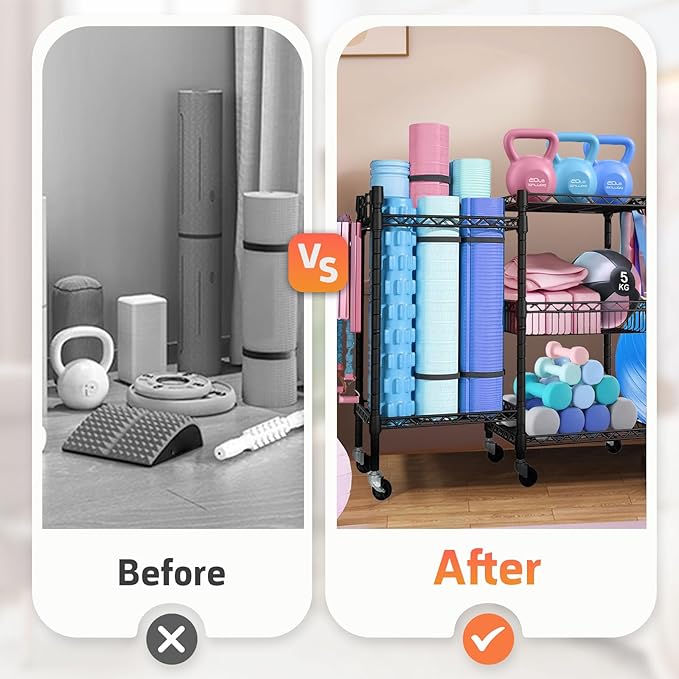 - 【3-Tier Adjustable Storage & Ball Holder】Adjustable height tiers customize space for varied equipment. Bottom tier’s dedicated exercise ball coil secures stability balls (yoga/Pilates). Maximize vertical storage for dumbbell sets or foam rollers.