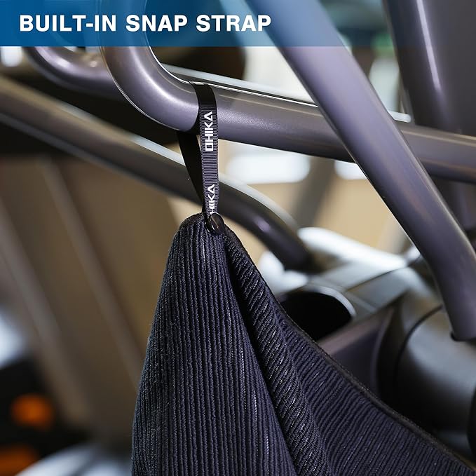 - The Convenient Snap Strap Closure: integrated on each towel, the strap enables you to hang it over the treadmill handle, your backpack, exercise bike, etc to keep your towel always within reach. The large towel rolls up into a travel-friendly size, perfect for anyone who likes to keep things neat and travels light.