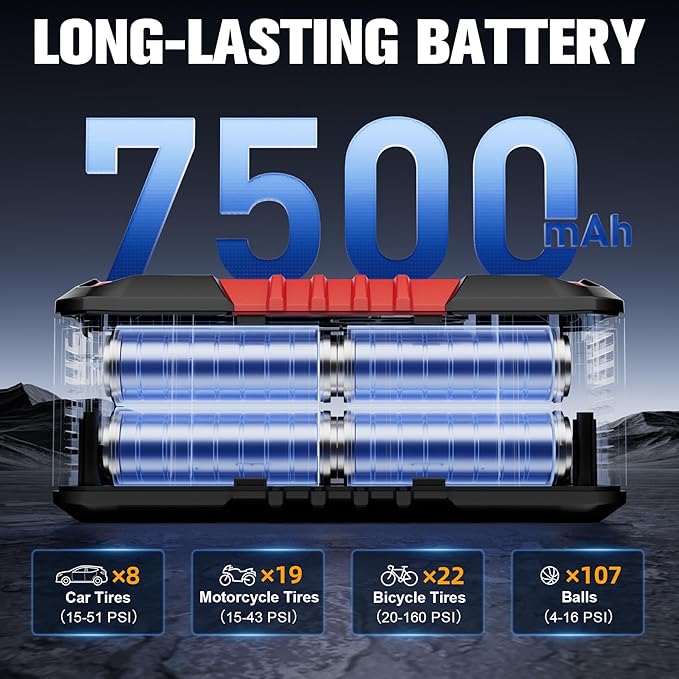 - EXTENDED BATTERY LIFE & CONSISTENT POWER: Powered by 7500mAh high-performance lithium batteries, GOOLOO A6 Gear offers cordless operation for up to 45 minutes —sufficient for inflating 4 car tires, 22 bicycle tires, 19 motorcycle tires, or 107 balls. This reliable air compressor pump also features a Type-C fast charging port so it’s always ready when you need it.
