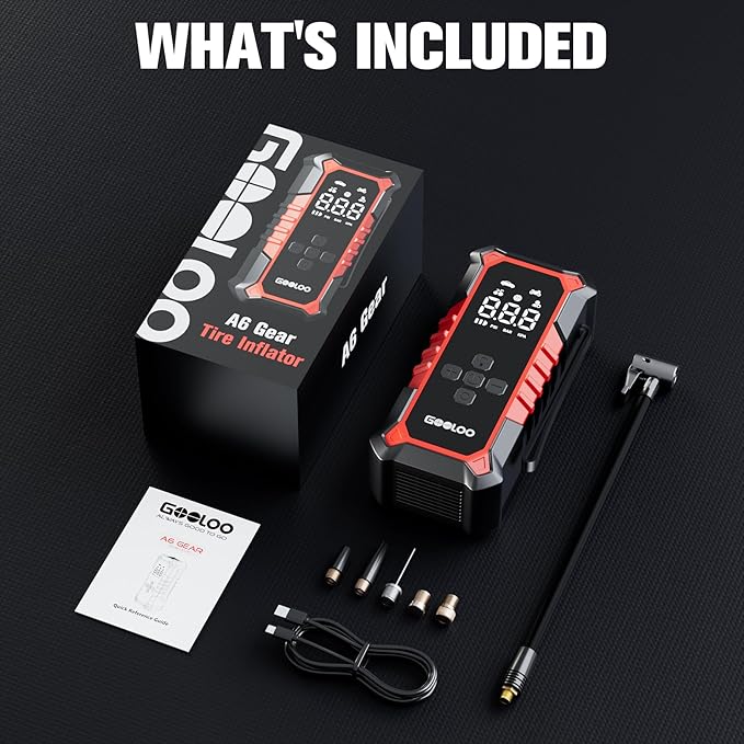 - WORRY-FREE INFLATION WITH SMART PROTECTION: Featuring a high-accuracy pressure gauge, GOOLOO A6 Gear electric air pump provides reliable pressure readings and automatically shuts off when the preset pressure is reached, preventing over-inflation. With built-in safeguards including over-temperature, short-circuit and over-current protection, it ensures safe, dependable performance for cars, bicycles, and more. Just start it and relax – it handles the rest.