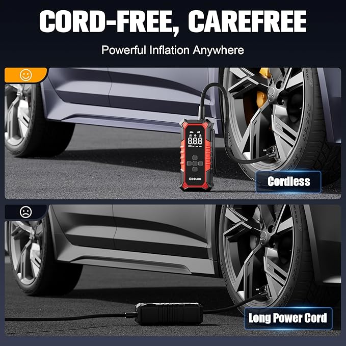 - QUICK & EFFORTLESS INFLATION: GOOLOO A6 Gear cordless air pump for car tires is equipped with a 21,000 RPM ultra-powerful motor, delivering up to 160 PSI. It can inflate a 205/55 R16 car tire from 30 to 36 PSI in less than 1 minute—perfect for daily maintenance or emergencies, helping you stay safe on the road.