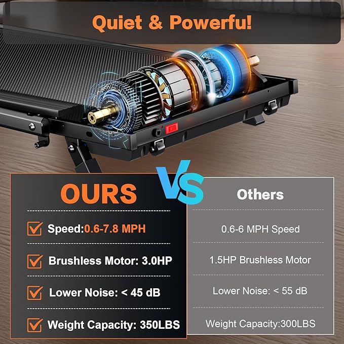 - 【3HP Silent Motor& 350 LBS Capacity】The walking pad with handle bar mit quiet 3.0HP motor with a maximum load of 350 pounds that provides smooth running at speeds ranging from 0.6-7.8mph,which can meet the exercise needs of you and your family at different stages better. The treadmill can manually adjust the inclination by 8% Combined with the APP to select a custom mode. It is immersive and increases your challenge.