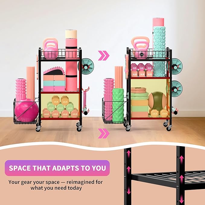 - [Adjustable & All-in-One Storage Solution]: This weight rack for home gym features an adjustable height design, allowing you to customize the spacing for different items like yoga mats, foam rollers, dumbbells, kettlebells, and resistance bands. With 3 tiers, side basket, and multiple hooks, this home gym storage rack keeps all your workout gear organized in one compact place.