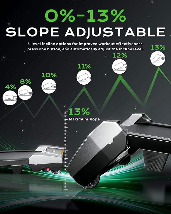 - [Walking Pad with Auto Incline]: Remote control automatically adjusts the incline, 5 levels of automatic lifting function, adjustable 0-13% incline angle, suitable for walking and jogging, you can be faster to improve the efficiency and weight loss, effectively shaping the buttocks and leg lines