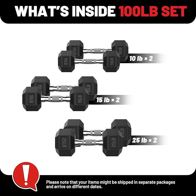 - 100 lb Dumbbells Set: Includes a pair of 10 pound, 15 pound, 25 pound rubber hex dumbbells, delivering lasting durability for strength training and exercise.