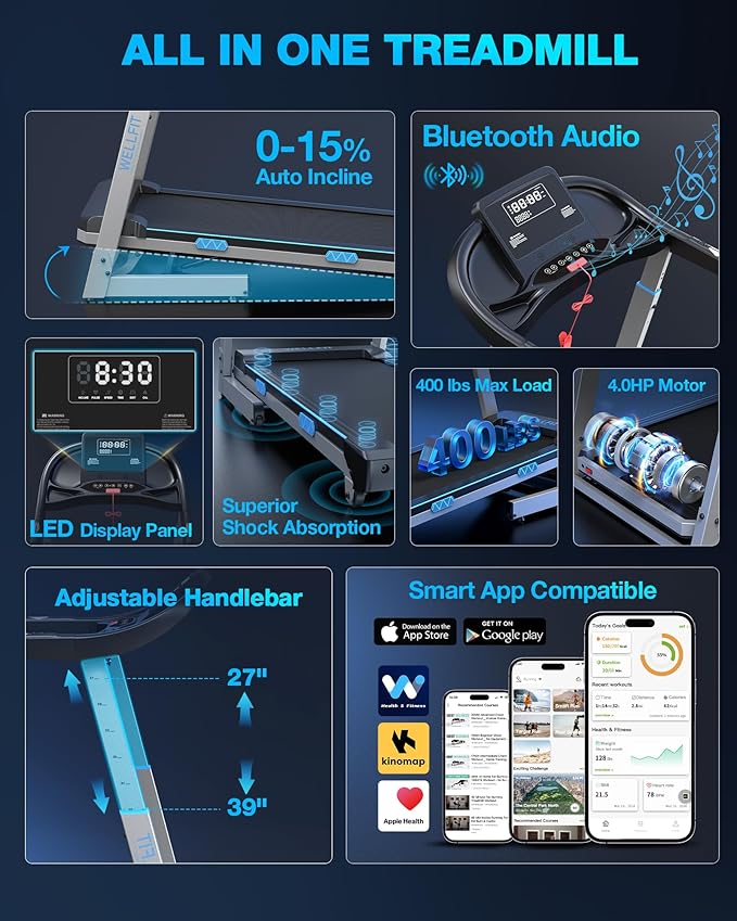 - 【Bluetooth Connectivity + App Sync – Smarter Workouts】Stay Connected While You Train. With built-in Bluetooth, pair your headphones for immersive music or connect to fitness apps like WELLFIT, KINOMAP, and Apple Health. Track progress, simulate outdoor routes, and stay motivated without distractions. This walking pad treadmill makes every workout more enjoyable and interactive.