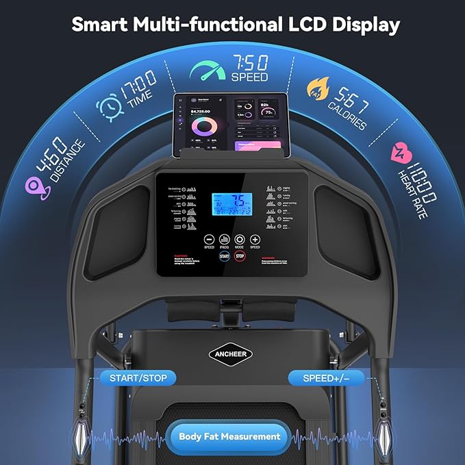 - 【Smart Fitness Tracking Treadmill】➤Dual Health Monitoring, Real-time heart rate tracking via handle sensors, Measure your body fat level easily in a few steps. Eliminates need for separate smart scales & HR monitors.With a Mult-function LCD display, you can track the real-time data on speed, incline, time, distance, calories, and heart rate.