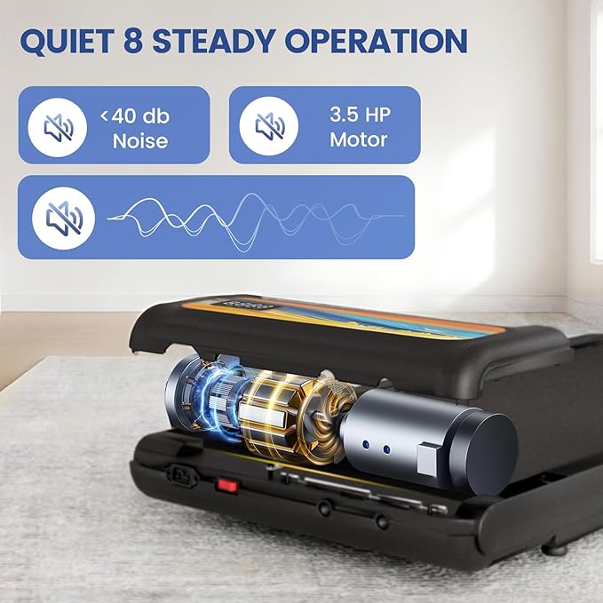 - 3.5 HP Powerful Motor: Equipped with a whisper-quiet 3.5 HP brushless motor operating under 40dB, this desk treadmill provides a powerful 120% surge horsepower while cutting energy use by 25% for efficient and tranquil workouts